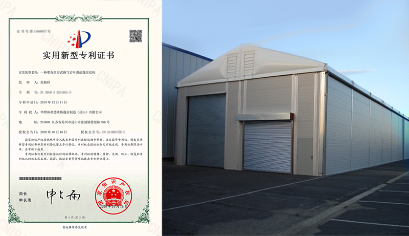 華燁海希德隆格篷房制造(昆山)有限公司新增1項由國家知識產權局頒發的實用新型專利證書,本實用新型的主要目的在于提供一種帶有拉簾式換氣百葉窗的篷房結構,能夠根據客戶的需求靈活的進行百葉窗的打開與關閉,提高篷房內的換氣通風功能,提高用戶的舒適度。